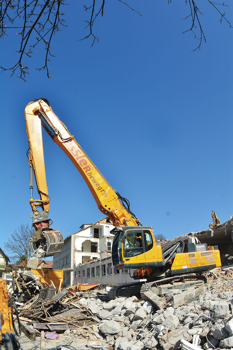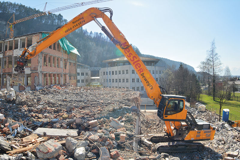 Zur Verbesserung der Standsicherheit wurden zwei Zusatz-Kontergewichte à 3 000 kg vorgesehen, die beim Straßentransport einfach per Ladekran abgenommen werden. Ausgetauscht wurden die Hubzylinder, diese stammen nun vom nächst größeren Hyundai-Kettenbagger – dem R380LC-9A. Der serienmäßige LC-Unterwagen, mit 2 680 mm Spurbreite und 4 940 mm Fahrwerkslänge, passte perfekt für die vergrößerte Ausrüstung.Angeschafft hat Christian Kessler die neue Maschine mit 600-mm-Dreistegbodenplatten für ein großes Rückbauprojekt in Götzis, 20 km südwestlich von Bregenz. Dort bricht Kessler den Vorarlberger Wirtschaftspark ab, hier entstehen nach Entkernung und Teilabriss vorhandener Gebäude und dem Abbruch von bis zu 18 m hohen Nebengebäuden 240 neue Wohnungen.