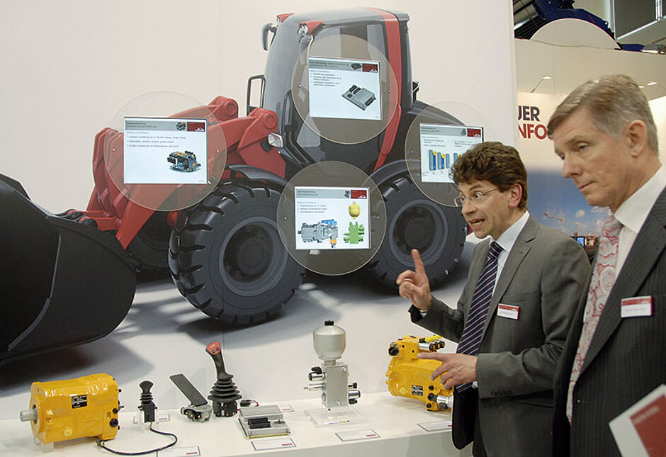 Zudem könne der Bediener am Touchscreen Raumkurven anpassen und so die Ausleger- oder die Stielbewegungen priorisieren. »Mit ein und demselben Handgriff am Joystick lassen sich somit andere Bewegungsabläufe in unterschiedlichen Geschwindigkeiten ausführen. Diese Adaptivität hat zur Folge, dass der Fahrer die Maschine immer optimal an die jeweilige Arbeitssituation anpassen kann und somit produktiver arbeitet.«Was sich nach aufwendiger elektronischer Regelungstechnik anhöre, sei in der Praxis sehr einfach aufgebaut und basiere auf der überlagert arbeitenden, klassischen Load-Sensing-Regelung, sagte Lehner. »Die Hydraulikpumpe regelt sich selbstständig ein, sodass man auf komplexe Sensorik vollständig verzichten kann. Dies ist ein großer Vorteil im rauen Baustellenbetrieb.«