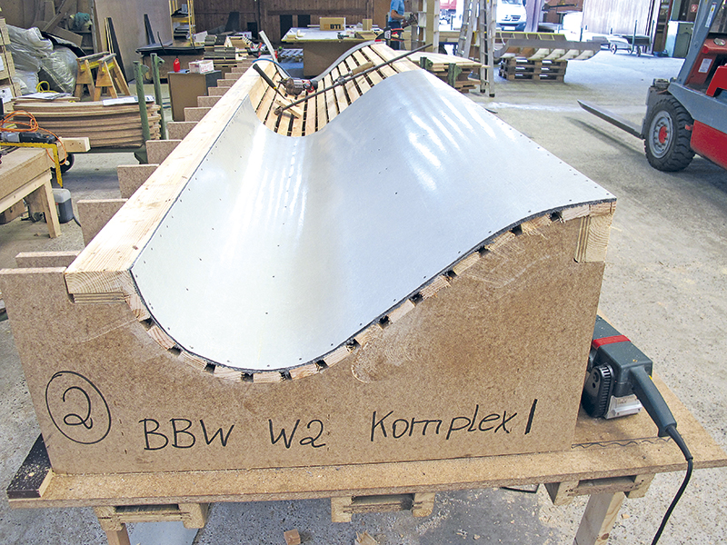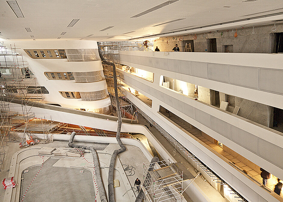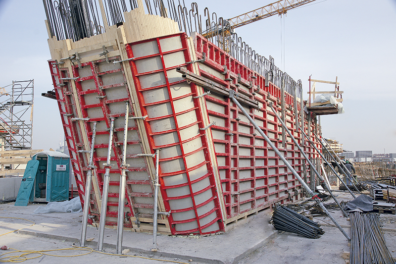 Die Canyon-Wände befinden sich zwischen den Kernen des LLC. Sie bestehen zumeist aus Brüstungen und Unterzügen. Das wesentliche Merkmal sind auch hier Neigungen und Rundungen. Wo immer möglich kam die serienmäßige Wandschalung, ergänzt durch Sonderteile und Holz-Sonderschalung, zum Einsatz. Wie bei vielen anderen Bauteilen stand hier eine minutiöse 3D-Planung vor der praktischen Umsetzung.Den Schalungsplanern und den Bauausführenden wurde auch in den anderen Bauabschnitten alles abverlangt. Immer wieder gab es unterschiedliche Formen zu schalen und natürlich zu betonieren. Dabei kam auch die alkus-Vorsatzschalung GM 6 zum Einsatz. Diese Platte lässt sich wie ein Teppich über die gebogenen Sonderschalungselemente legen und kann problemlos befestigt werden. Damit sind ohne Qualitätsverlust viele Einsätze mit gleichbleibender Betonoberfläche möglich.