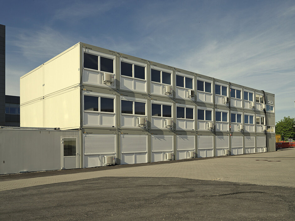In der dreigeschossigen und 1 080 m² großen Anlage finden sich in den Obergeschossen Büro- und Besprechungsräume, Aufenthalts- und Sanitärräume, während das Firmenrestaurant im Erdgeschoss untergebracht ist. Alle Räume sind durch Splitklimageräte zu heizen und zu kühlen. Die Anlage besteht aus 60 ELA-Premium-Containern, die beispielsweise als Flure, innenliegendes Treppenhaus, voll ausgestattete Küchen oder Technikräume zum Einsatz kommen. Großzügige Fensterflächen und verglaste Außen-Doppeltüren sorgen für eine helle und freundliche Atmosphäre. Die Bodenbelagskombination aus PVC und Nadelfilz ist funktional und komfortabel zugleich.