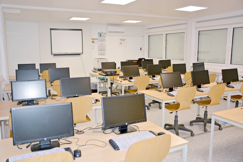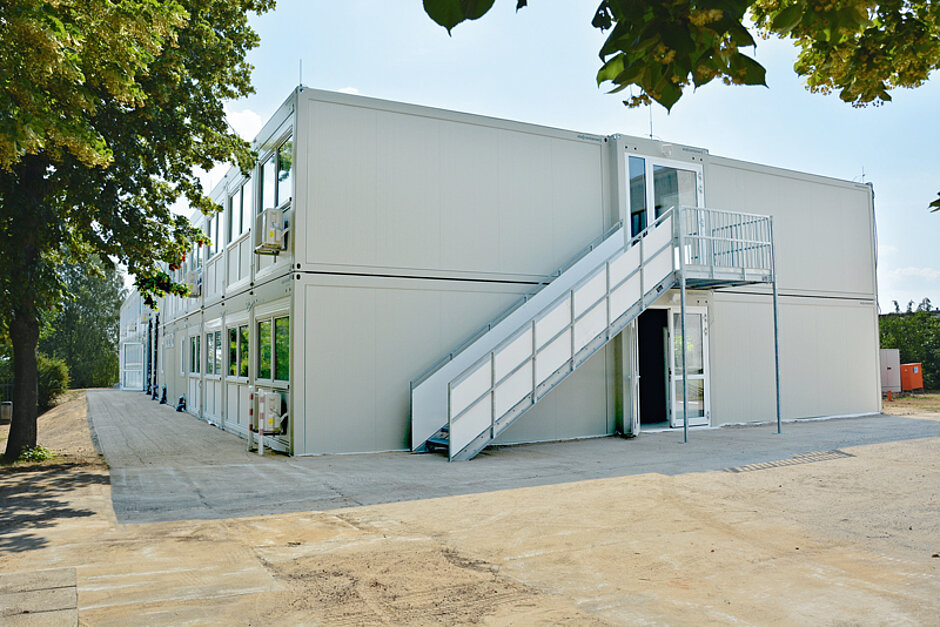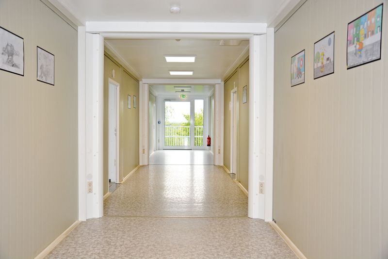 Die beiden Stockwerke der Schule sind über innen- und außenliegende Treppen erreichbar. ELA-Flurmodule verbinden die Räume miteinander. »Insbesondere bei Schulen gibt es hohe Anforderungen an Aufenthaltsqualität, Raumklima und Sicherheit«, erklärt Frank. »Wir haben unsere Container-Räume dahingehend optimiert und statten die Anlagen standardmäßig mit moderner Beleuchtung, Split-Klimageräten zum Heizen und Kühlen, großen Dreh-Kipp-Fenstern sowie umfangreichen Sicherheitseinrichtungen aus.« Auch Mobiliar wie Tafeln, Lehrerpulte, Tische, Stühle, Garderoben oder Teeküchen sind optional Teil des Lieferumfangs für ELA-Interimsschulen.