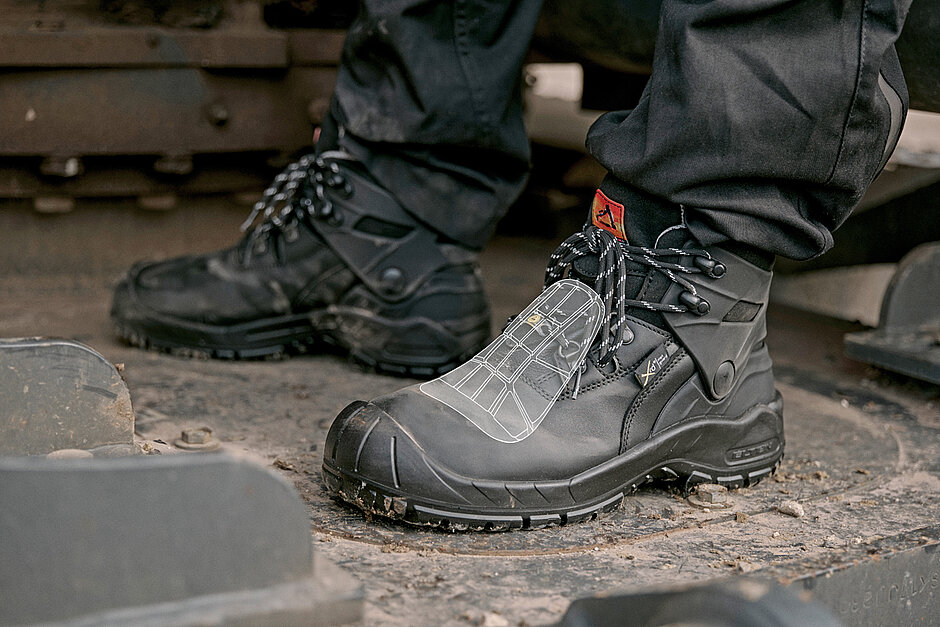Ein zusätzlicher Schutz – in diesem Fall vor herunterfallenden Gegenständen – ist der Mittelfußschutz »XRD Met Guard«, über den der »Elio« ebenfalls verfügt. Der flexible und stoßdämpfende Einsatz aus Polyurethan-Schaumstoff (Poron) wird direkt in den Spannbereich des Schuhs eingesetzt und schützt laut Anbieter die Mittelfußknochen vor Verletzungen durch Stöße und Gefahren von oben. Es handle sich dabei um eine gute Ergänzung zur Stahlkappe und dem Durchtrittschutz aus Stahl, der Verletzungsrisiken durch spitze Gegenstände abwehre. Die nötige Widerstandsfähigkeit für die Baustelle soll der »Elio« zudem durch sein Obermaterial aus Rindleder und wasserabweisender Mikrofaser mitbringen. Die Materialien zeigen sich robust und leicht zu reinigen. Zudem hat der Sicherheitsstiefel eine grobstollige Sohle aus Polyurethan, die sicheren Halt auf unebenen Böden unterstützt.t