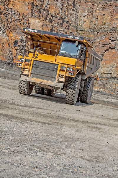 Ein weiteres Argument für die BKT-Reifen stellte für CEMEX die Vor-Ort-Betreuung durch Bohnenkamp dar. Nach einer ersten Abstimmung wurde ein Termin zur Begutachtung der örtlichen Gegebenheit vereinbart und ein erster Muldenkipper testweise mit dem BKT Earthmax SR 45 ausgerüstet. Schmidt: »Bohnenkamp gab uns für die BKT-Reifen eine 2 000-Stunden-Garantie. Das entspricht der Laufleistung der Produkte anderer Premiumhersteller in unserem Steinbruch. Diese Vorgabe wurde von den Reifen problemlos erfüllt. Für uns ist so ein Satz von vier Hinterreifen dieser Größe auch eine Investition, die es abzusichern gilt und durch die Garantie war unser finanzielles Risiko in Bezug auf die Reifen gering.« Im Test konnten die Reifen überzeugen, sodass mittlerweile auch ein zweiter CAT 775E auf der Hinterachse sowie ein Radlader CAT 980 mit BKT-Reifen ausgerüstet wurden. Ein wichtiger Faktor ist auch der gute und schnelle Service von White, die mit ihrem Spezial-Truck für einen Reifenwechsel direkt in den Steinbruch kommen und den Reifen dort vor Ort montieren. »Das spart eine Menge Zeit. Denn so muss für die Montage noch nicht einmal die Felge demontiert werden, sodass ein Reifenwechsel innerhalb weniger Stunden möglich ist«, freut sich Schmidt.