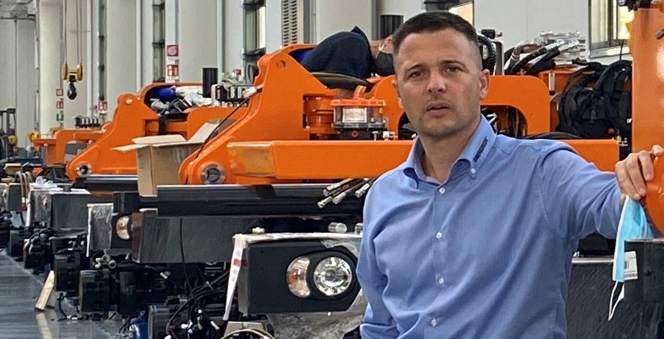 Daniele Fraron vor der Produktionslinie der selbstfahrenden Geräteträger ILF. In diesem Jahr werden dort allein vom Typ ILF Alpha mehr als 100 Einheiten produziert.