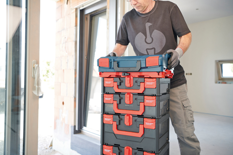 Grundlage für den Einsatz der Adapterplatte ist die Anwendung einer der acht neuen »Straussboxen«. In den unterschiedlichen Formaten findet von Kleinteilen über Werkzeuge wie Schraubendreher bis zu größeren Maschinen wie Handkreissägen alles einen optimalen Platz. Dei kleinste »Straussbox mini« lässt sich aufgrund der Lebensmittelzulassung zusätzlich auch als Brotdose nutzen. Alle Werkzeugboxen sind laut Strauss nach IP43 fremdkörper- und sprühwassergeschützt: Feuchtigkeit und Schmutz haben so keine Chance, ins Innere zu gelangen. Für Werkzeuge und Maschinen bedeutet das zuverlässigen Schutz. Die »Straussboxen« erweisen sich laut Hersteller als praktische Werkzeugbox, die auch harten Bedingungen auf der Baustelle standhält. Sorge dafür trägt das hochwertige und bruchfeste Acrylnitril-Butadien-Styrol (ABS) – bei einer starken maximalen Traglast von 125 kg.