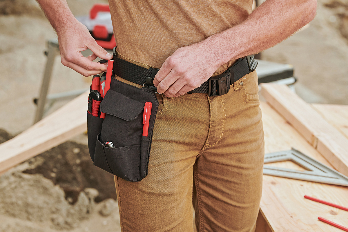 Zur Verfügung stehen fünf Werkzeugtaschen in unterschiedlichen Größen. Von den praktischen Allround-Taschen in klein und groß bis hin zur spezieller gestalteten Zollstock-/Messertasche, Nagel- und Schraubentasche sowie dem Multipocket soll für alle Gewerke eine passende Ausrüstung dabei sein. Durch frei verschiebbare Magnetmodule können bis zu vier Werkzeugtaschen in unterschiedlichen Zusammenstellungen am Gürtel getragen und zügig ausgetauscht werden.