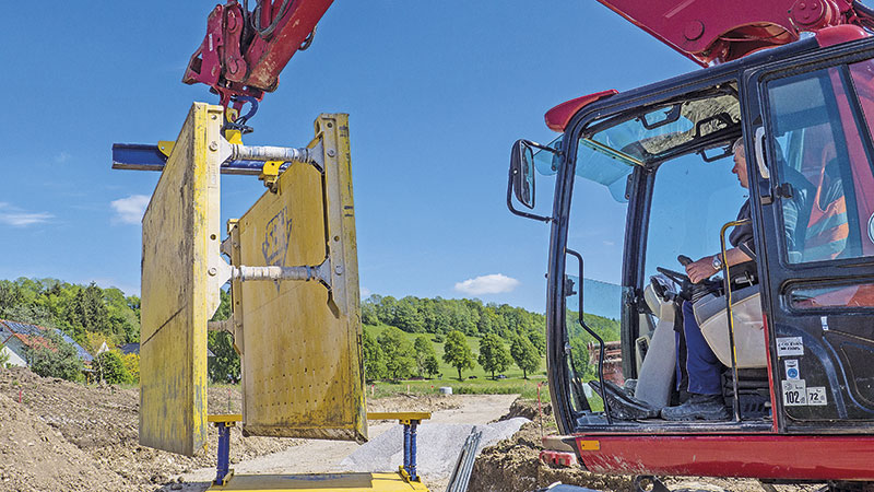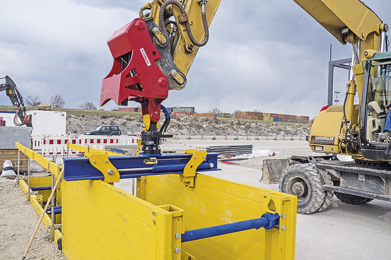 Der Wegfall lästiger Arbeitsabläufe und die schnelle, gezielte Platzierung, ohne dass der Verbau durch eine Hilfskraft geführt werden muss, begeisterte nicht nur die Mitarbeiter auf der Baustelle, sondern eröffnet ein hohes Einsparpotenzial. Berechnungen des Entwicklers haben ergeben, dass sich das Anbaugerät – auch unter Berücksichtigung der Zeiten, zu denen es nicht im Einsatz ist – innerhalb von nur einem Jahr bezahlt machen kann. Auch beim Rückbau der Verbauelemente in Markt Rettenbach konnte der Verbaugreifer das Team der Firma Kutter überzeugen. In Verbindung mit hydraulischen Anbauverdichtern beschleunigt sich der Arbeitsablauf, die Produktivität steigt.Mit dem Verbaugreifer könne man einfach mehr Rohre pro Tag verlegen, freute sich der Polier. Für den Einsatz mit dem Verbaugreifer bietet die Firma SBH-Tiefbautechnik spezielle Verbauboxen an. Diese SBH-Boxen sind bereits werkseitig mit den entsprechenden Aufnahmebuchsen ausgestattet. Vorhandene Boxen können schnell mit den Aufnahmebuchsen nachgerüstet werden. Entsprechende Umrüstsätze für alle gängigen Verbausysteme können bei Schmölz bezogen werden. Als besonderen Service bietet Schmölz an, die Umrüstarbeiten direkt auf der Baustelle durchzuführen.