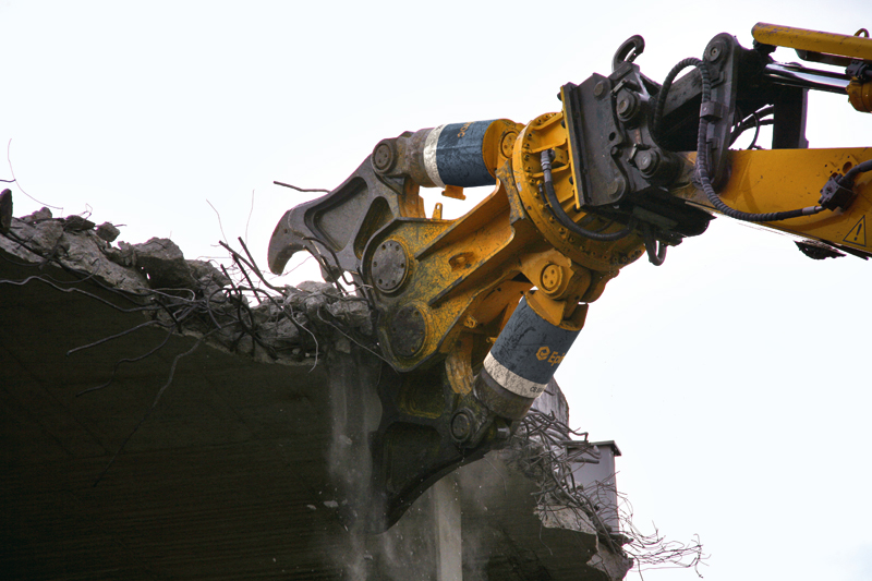 Beim oberirdischen Abbruch kam die bereits bewährte CC 5000 Abbruchschere zum Einsatz. Sie hat ein Gewicht von etwa 5,5 t und eine Maulweite von 1.600 mm. Im Keller warteten starke Wände und größere Fundamente. Die mit dem Hydraulikhammer HB 4700 vorgeschlitzten Wände wurden schließlich mit der neuen Beton-Abbruchzange CB 5500 herausgetrennt und zum Pulverisieren bereitgelegt.