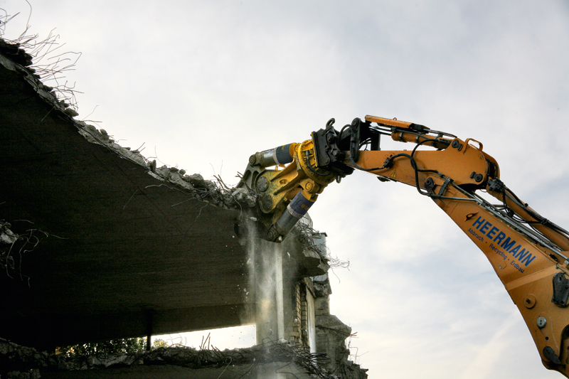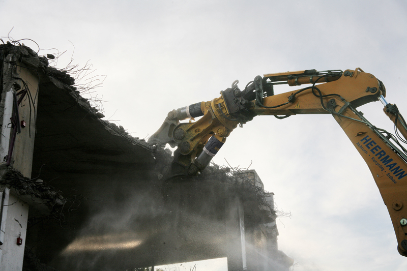 Zunächst wurden Entkernungs- und Sanierungsarbeiten mit Hilfe eines Multigreifers MG 5000 durchgeführt. Darauf folgte der Abbruch einer Verbindungsbrücke sowie des Verwaltungsgebäudes, inklusive des stark bewehrten Luftschutzbunkers.