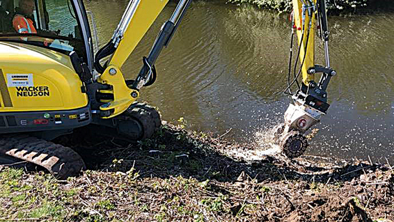 Erkat-Fräsen stehen seit mehr als 20 Jahren für Vielseitigkeit und Qualität. Das Portfolio wird permanent erweitert, wobei die Innovationen selbst ungewöhnlichen Einsatzgebieten Rechnung tragen. Ein neuer Holzschneidkopf will dem Anspruch besonders gerecht werden – das Modell ER 250 musste sich bereits in der Praxis im Kanalaushub beweisen: Bei der Rodung einer Böschung nahe Hamburg sollten die Baumstümpfe ebenfalls entfernt werden. Für Epiroc-Produkt-Manager Ralf Schumann ein perfekter Anlass, eine Neuentwicklung aus dem Hause Erkat vorzuführen: »Wir haben einen neuen Schneidkopf für unsere Fräsen entwickelt, der speziell dazu gedacht ist, Holz zu zerkleinern«, sagt Schumann. »Eine vergleichbare Entwicklung gab es bisher für diese kleinen Baggerklassen nicht. Es war eine echte Marktlücke!«