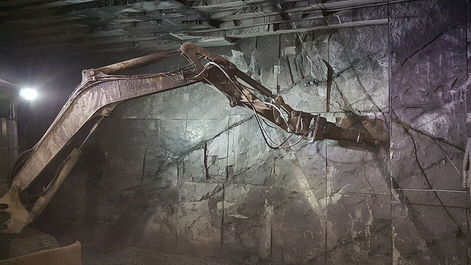 Der speziell entwickelte Hydraulikhammer SB 202 von Epiroc gewährleistet vor Ort einen effizienten Abbau. Im Bergwerk Katzenberg sind seit 2013 insgesamt sechs dieser Hämmer im täglichen Einsatz – je drei bis vier Stunden pro Schicht. Zwei dienen als Reserve, die restlichen vier sind an den Bobcat E50, Komatsu PC45 und Schaeff HR18 angebracht. Sie werden genutzt, um den abbauwürdigen Schiefer, der vorher per Diamantsäge entlang der geologischen Gegebenheiten in Raster gesägt wurde, zu lösen respektive aus der Wand herauszubrechen.