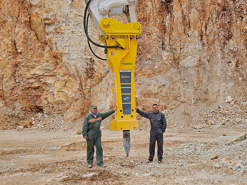 Der HB 10000 weist ein Dienstgewicht von 10 t auf und liefert eine Einzelschlagenergie von 16 000 Joule, die mit einer Frequenz von bis zu 380 Schlägen pro Minute abgegeben wird. Der Hydraulikhammer wird bei der Profilierung von Abbauwänden und Sohlen nach jedem Abschlag eingesetzt. Beton Tomiši´cs Steinbruch verfügt bereits über eine breite Auswahl an Hydraulikhämmern, darunter den HB 7000 von Atlas Copco und über 20 Jahre alte Legacy-Modelle von Krupp (beide heute Epiroc), was die anhaltende Zuverlässigkeit und Anpassungsfähigkeit von hydraulischen Anbaugeräten über Generationen hinweg zeigt. Als Beleg für die Leistungsfähigkeit und Zuverlässigkeit der Hydraulikhämmer von Epiroc erklärt Igor Tomiši´c, CEO von Beton Tomiši´c: »Die Produktivität und Zuverlässigkeit unseres Atlas Copco HB 7000 waren außergewöhnlich, daher war die Entscheidung für den Epiroc HB 10 000 ein logischer Schritt für unsere Betriebsabläufe. Die Unterstützung des Geschäftspartners von Epiroc in Kroatien, Matkovic94, ist eine großartige