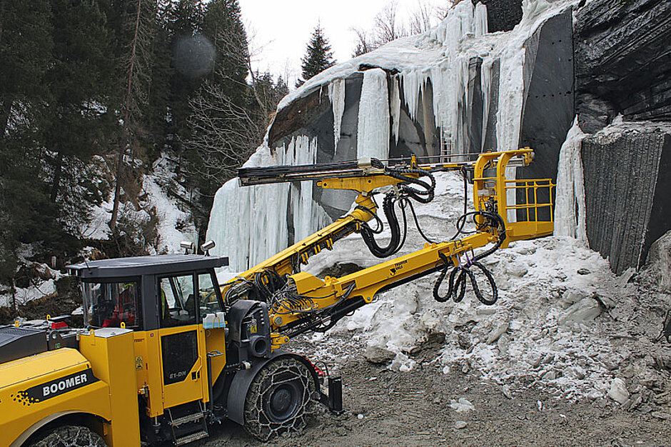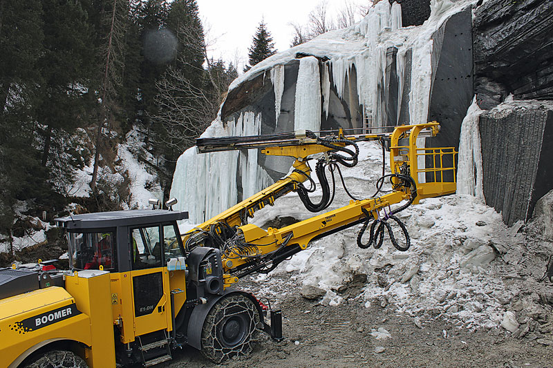 Der Valser Steinbruch ist mit 500 m Länge relativ weitläufig, mit dem Boomer E1C DH lässt sich von einem Ende des Steinbruchs zum anderen fahren, die Maschine positionieren und bohren. »Und das ganz ohne Anschlussleitungen zu verlegen und dank des integrierten Wassertanks sogar ohne mich um die Wasserversorgung kümmern zu müssen«, so Truffer. Positiv habe man auch vermerkt, dass der Boomer über »eine gewisse Geländegängigkeit« verfüge, um alle Einsatzorte zu erreichen.