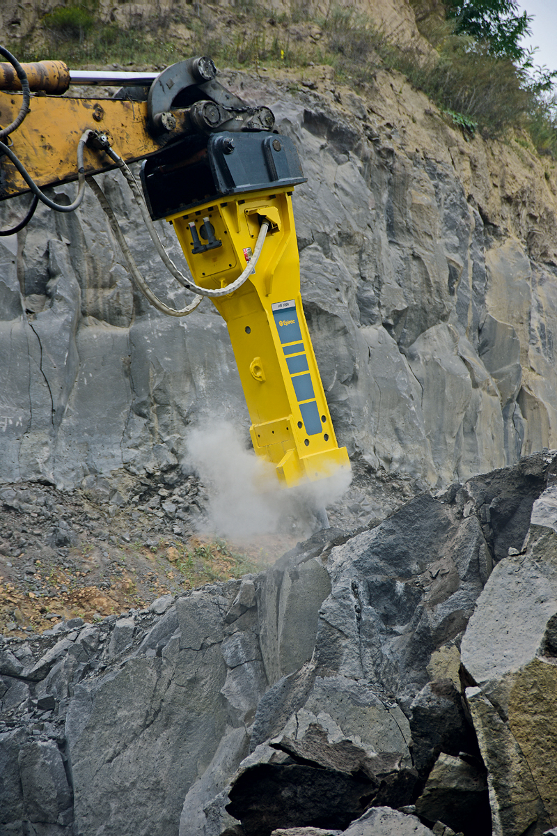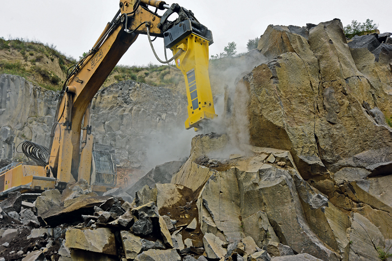 Seit Januar 2016 nutzt Mendiger Basalt auch den größten Serien-Hydraulikhammer der Welt, den HB 10000, in der Schottergewinnung – und schätzt ihn wegen der hohen Effizienz und Leistung als wirtschaftliche Alternative zum Sprengen. Für die meisten Arbeiten sei die Schlagkraft des HB 7000 ausreichend, so Krings, »wir mussten aber feststellen, dass es immer wieder Bereiche gibt, die besonders fest und kompakt sind und sich mühsamer lösen lassen. Der HB 10000 ist da schon beeindruckend, denn die etwa 30 % höhere Schlagenergie ermöglicht es uns, auch die schwer abbaubaren Bereiche wirtschaftlich zu erschließen.« Generell sind die beiden größten Hydraulikhämmer im Paralleleinsatz und schaffen zusammen Einsatzzeiten von rund 2 000 Betriebsstunden im Jahr. t