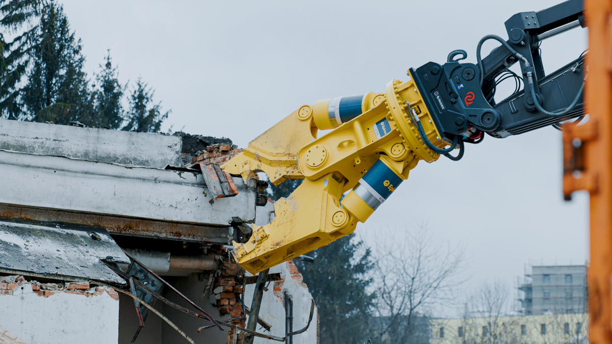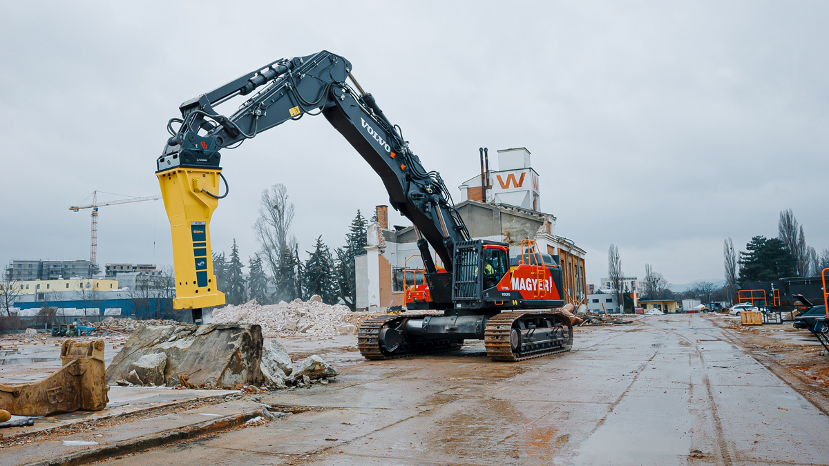 Bei Anbaugeräten setzt Magyer auf die Qualität von Epiroc und stattet seine Maschinen mit zahlreichen hydraulischen Anbauwerkzeugen aus, um sämtliche Einsatzmöglichkeiten effizient abzudecken. Für die High-Reach-Ausrüstung am neuen Volvo Bagger kommen eine Epiroc Betonzange CB 2500 und ein Sortiergreifer MG 2700 zum Einsatz.