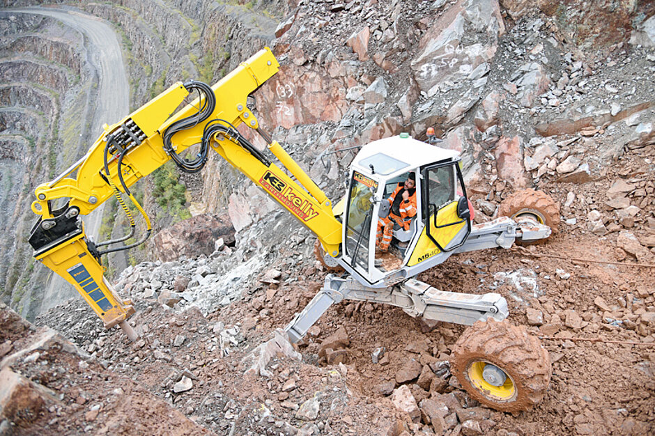 Der 157 PS starke Menzi Muck aus der 12-t-Klasse arbeitete sich mit dem MB 1200 von Epiroc kontrolliert durch den Fels, obwohl der Hammer eigentlich für Trägergeräte der 15-t- bis 26-t-Klasse konzipiert ist. »Der Menzi ist einfach ein enormes Kraftpaket«, bestätigt Kelly. »Mit der Powerline-Pumpe stellt er mehr als 200 l/min Hydrauliköl bereit. Das ist weit mehr, als der Epiroc-Hydraulikhammer braucht.« Die Hubkapazität beträgt selbst bei seiner maximalen Reichweite von 6 m mehr als 4 t. Damit zeigte sich der Menzi als ein idealer Träger für hydraulische Anbaugeräte. Mit einem 120 mm dicken Meißel brachte es der MB 1200 auf 340 bis 680 Schläge pro Minute, was laut Gerry Kelly mehr als ausreichte, um das Hartgestein zu brechen.