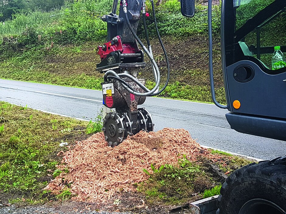 Nichtdestotrotz beschreibt Erkat das Ergebnis als »beeindruckend«. Die hohe Schneidkraft und Robustheit der Fräse ermöglichen auch Arbeiten im Bodenbereich, wie etwa den Abtrag des Baumstupfes unterhalb der Grasnarbe. Dabei existiert keine Begrenzung in der Tiefe. Durch den Anbau am Baggerarm wird eine große Reichweite ermöglicht – auch über Hindernisse wie Gräben oder Böschungen hinweg.