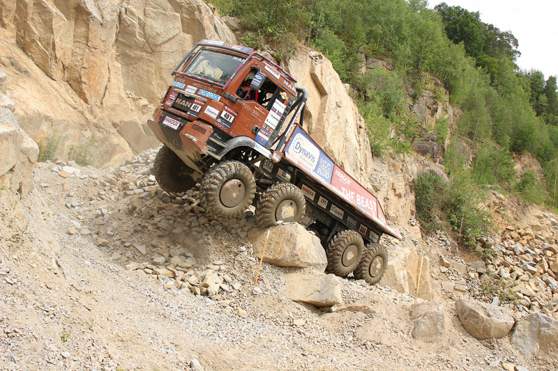 Gleich am zweiten Tor der ersten Sektion saßen sie aber mit einer Kardanwelle zwischen dem Verteilergetriebe und der zweiten Achse auf, wobei die Kardanwelle in zwei Stücke riss. Aus dieser misslichen Lage konnten sich die beiden nicht mehr aus eigener Kraft befreien, sodass ihr MAN TGS mit einem Bagger geborgen werden und die beiden einen großen Rückstand hinnehmen mussten. Dank der Hilfe des BFS-Serviceteams und von MAN konnte kurzfristig ein Ersatzteil beschafft und der Schaden repariert werden. Marcel Schoch und Johnny Stumpp starteten eine Aufholjagd, konnten aber das führende Team Reicher nicht einholen und landeten zum Schluss auf dem zweiten Platz. Nachdem das »HS-Schoch Hardox«-Team sowie das Reicher-Team bisher je zwei erste und zwei zweite Plätze erzielen konnten, ist ein Kopf-an-Kopf-Rennen entbrannt, bei dem Schoch und Stumpp nur knapp die Nase vorn haben, da ihr Konto weniger Fehlerpunkte aufweist. Entsprechend spannend dürften sich die beiden noch ausstehenden Läufe der Saison gestalten. Schon am 19. und 20. August geht es in Limberg (Österreich) wieder »zur Sache«. §