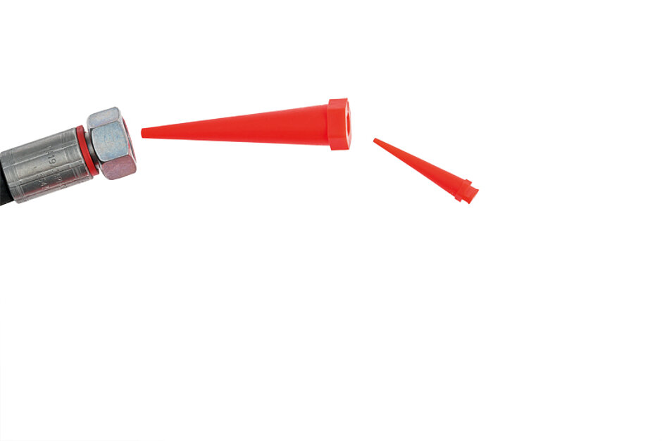 Zunächst fällt die signalrote Farbe der Kegel ins Auge – die Farbe mag für die Funktion unerheblich sein, sucht man jedoch nach dem Wartungsstopfen ist eine auffällige Optik von Vorteil. Zudem ist der Stopfen im Einsatz dank der Farbgebung sehr gut zu erkennen.