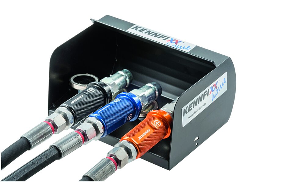 Kennfixx dient in der Bauwirtschaft dazu, Arbeitsabläufe zu vereinfachen und Fehlerquellen zu vermeiden. Kennfixx home gibt den Leitungsanschlüssen am Anbaugerät zudem ein »ordentliches« Zuhause. Die spezielle Parklösung sorgt mit vier Starkmagneten für sicheren Halt der verschiedensten Kupplungsvarianten und Steckergrößen. Das Standardgehäuse bietet Platz für vier Leitungen, auf Wunsch sind auch andere Größen realisierbar.