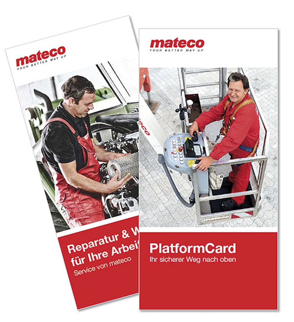 In abgestimmten Print- und Onlinemedien können sich Kunden einen einheitlichen und schnellen Überblick über die Leistungen des Unternehmens verschaffen. Im Bereich »gedruckte Medien« können Anwender auf das »Arbeitsbühnen-Mietprogramm«, die eigene Zeitschrift »mateco news« oder auf Flyer für die »Wartung und Reparatur von Fremdarbeitsbühnen« sowie die »Sicherheitsschulung PlatformCard« zurückgreifen. Alle gedruckten Broschüren finden sich auch zum Download auf der Homepage des Arbeitsbühnenvermieters. Neben der Homepage, auf der alle Produkte und Leistungen des Unternehmens aufgeführt sind, bietet mateco auch sogenannte microsites, auf denen sich der Kunde über spezielle Bereiche informieren kann. Eine für Smartphones optimierte Version ist in Vorbereitung, auch das Engagement in sozialen Netzwerken soll ausgebaut werden.