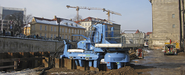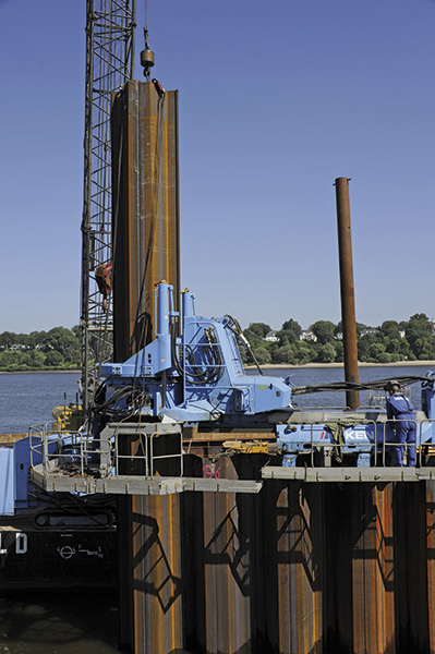 Der ECO700S presst Einzel-Z-Profile bis 708 mm Breite und Einzel-U-Bohlen bis 750 mm Breite ein. Der ECO1400S ist für das Einpressen von Doppel-Z-Profilen mit einer Gesamtbreite bis 1 416 mm sowie Doppel-U-Profilen mit einer Gesamtbreite von 1 200 mm und 1 400 mm zuständig. Die Doppel-U-Presse (ECO1400S) wurde ebenfalls erfolgreich getestet und ist jetzt einsatzbereit.Die bestehende Ufersicherung der Böschung am Lotsenhaus Seemannshöft an der Einfahrt des Hamburger Hafens und an der Mündung des Köhlfleetes in die Elbe sollte nun durch eine vorgerammte Stahlspundwand ersetzt werden. Wegen der Gefahr von Böschungsbrüchen wurde als Einbringverfahren ein schonendes hydraulisches Einpressverfahren vorgeschrieben – daher kam der GIKEN Silent Piler zum Einsatz. Hier wird beim Pressen, im Gegensatz zum Rammen oder Vibrieren, lediglich statischer Druck erschütterungsfrei auf die Bohlen ausgeübt. Am Lotsenhaus kam ein Z-Profil mit einem Wy von 2 600 cm³/m und einer Breite von 700 mm zum Einsatz. Die Länge betrug 16 bis 18 m. Den Auftrag erhielt die Firma Hermann Koth Ingenieurbau mit ihrer GIKEN-Presse ECO700S. Während des Bauablaufs wurde zusätzlich die ECO1400S (Bild) wegen der höheren Steifigkeit der Doppelbohle gegenüber der Einzelbohle eingesetzt. Die ECO1400S kann Z-Profile als DB einvibrieren. Mittels Presskopfwechsel kann die ECO1400S U-Profile bis zu einer Breite von 1 416 mm einpressen. Zusätzlich kann sie mit einer Spülhilfe (Water Jetting Modus) bei Z- und U-Profilen angewandt werden. Im Bohr-Press-Modus (Super Crush Modus) ist die Anwendung nur bei Doppel-Z-Profilen möglich.