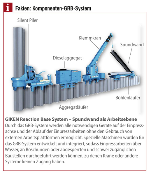Durch Ausnutzung des Reaktionsprinzips können alle für das Einpressen von Spundbohlen erforderlichen Geräte oben auf der Spundwand eingesetzt werden, ohne dass temporäre Arbeitsplattformen erforderlich werden. Spezialgeräte wurden konstruiert, entwickelt und in das integrierte GRB-System (GIKEN Reaction Base System) systematisiert, sodass der gesamte Einpressbetrieb bequem auch über Wasser an Dammabhängen und entlang sehr eingeengter Baustellen ausgeführt werden kann, wo normale Rammanlagen oder Krane keinen Zugang haben. Besonders bei Wasserbaustellen erfordern umfangreiche Bauhilfsmaßnahmen manchmal mehr Aufwand und Zeit als die eigentliche Baumaßnahme selbst. Das Prinzip des GRB-Systems besteht darin, dass der Silent Piler auf der Spundwand selbstständig schreiten kann und die Spundwände kontinuierlich einpresst. Der GRB-Kran schreitet ebenfalls selbstständig und folgt dem Silent Piler auf der bereits erstellten Spundwand. Er dient dazu, dem Silent Piler die Spundwände anzureichen, die mittels eines speziellen Transportsystems auf der Spundwand herangefahren werden. Als zusätzlicher Vorteil des GRB-Systems gilt auch, dass der Verkehr auf beiden Seiten der Spundwand während der Bauarbeiten nicht beeinträchtigt wird.