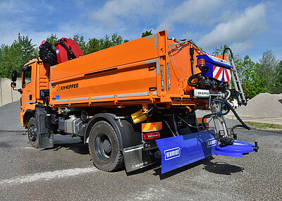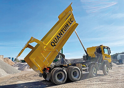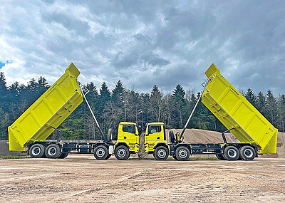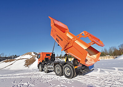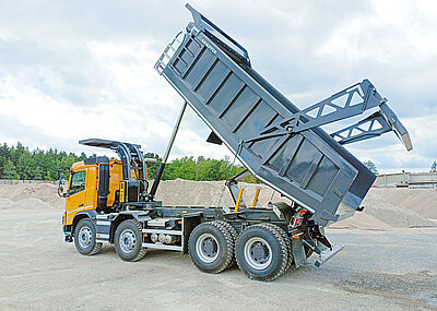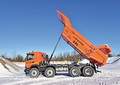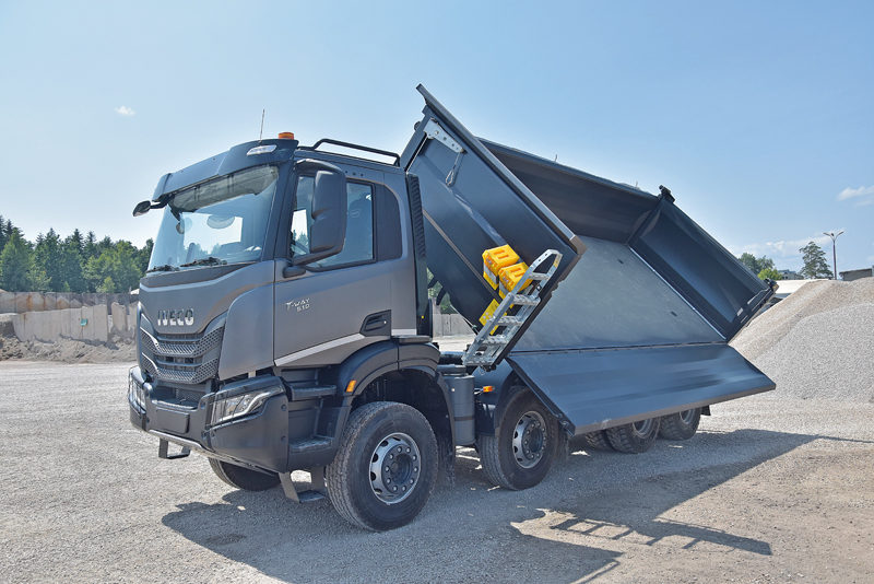 Der Nachfolger des »Trakker« von Iveco ist der leistungsstarke T-Way mit erhöhter Bodenfreiheit für extreme Offroad-Bedingungen. KH-Kipper hat dieses Fahrgestell jetzt mit einem dreiseitigen Aufbau des Typs W3H ausgestattet. Mit Unterflurkippzylinder von Nummi verfügt dieser über eine, per Joystick gesteuerte, hydraulische Seitenbordwand, die sich je nach Fahrgestellkonfiguration stufenlos von der vertikalen Position bis zu 180° öffnen lässt. Damit kann ein Gabelstapler bis an den Kipper heranfahren und palettierte Materialien wie Pflastersteine effizient beladen. Beim Absenken der Seitenwand bis zum Winkel von 90° ist es möglich, das Material in einiger Entfernung vom Fahrzeug zu entladen. Das Entladen von Schüttgut erfolgt automatisch bei pendelnder Bordwand, sobald die unteren Haken entriegelt werden. Die besondere Metalloptik verdankt der Aufbau modernen Lackmaterialien von Novol, die dem Aufbau auch eine entsprechende mechanische Beständigkeit geben sollen. t