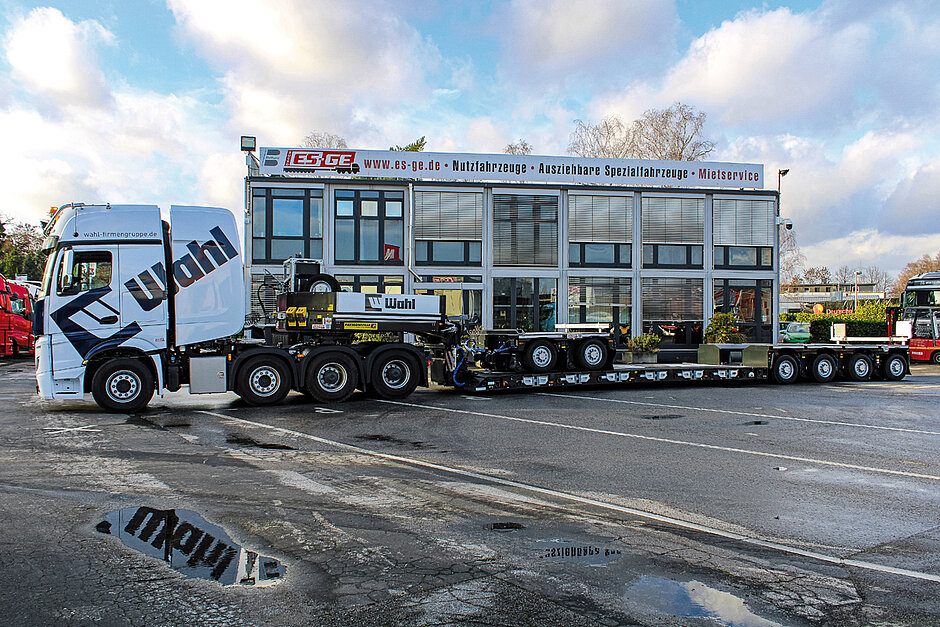 Den Antrieb des komplett von der ES-GE geplanten Zuges übernimmt eine Sattelzugmaschine des Typs Actros 5 L-FHS 8x4. Unter der Haube des 4-Achsers arbeitet ein 15,6- l-Motor mit 460 kW/625 PS. Seine sechs Zylinder treiben zwei der vier Achsen an, die laut Fahrzeugschein ein zulässiges Gesamtgewicht von 41 000 kg bieten. Rund 180 t sind beim Zuggesamtgewicht hinterlegt. Verbindendes Element zwischen Motor und Antriebswelle ist eine Turbo-Retarder-Kupplung, die selbst beim Rangieren mit hohen Lasten ein punktgenaues Arbeiten ermöglichen soll und als effizienter Retarder mit einer hohen Bremsleistung dient.