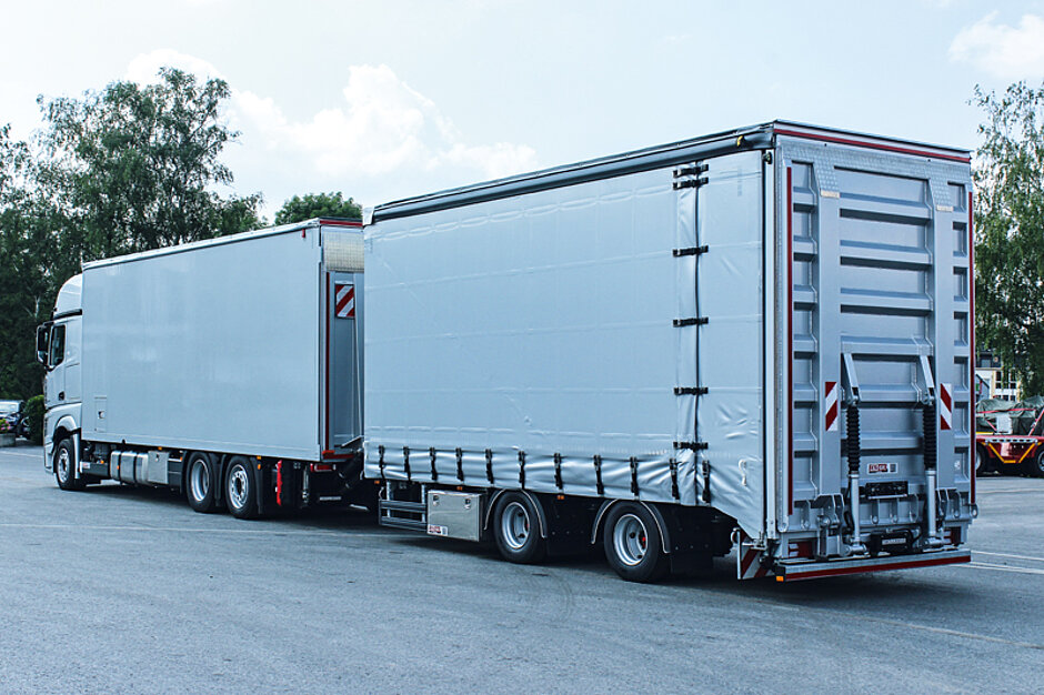 Die Ladebordwand, die über eine NATO-Dose am Heck des Lkw mit Strom versorgt wird, eignet sich technisch für eine Last bis zu 9 t – auch beim Einsatz als Überfahrrampe. Wird es zu eng beim Beladen über die Rampe, lässt sich der Heckportalrahmen auf eine Breite von insgesamt ca. 3 300 mm erweitern. Im Zusammenspiel mit der überlangen Plane ermöglicht der ES-GE-Anhänger somit den Transport von überbreiten Geräten unter Plane. Mitgelieferte Überbreitetafeln vorn und hinten mit LED-Positionsleuchten warnen andere Verkehrsteilnehmer. t