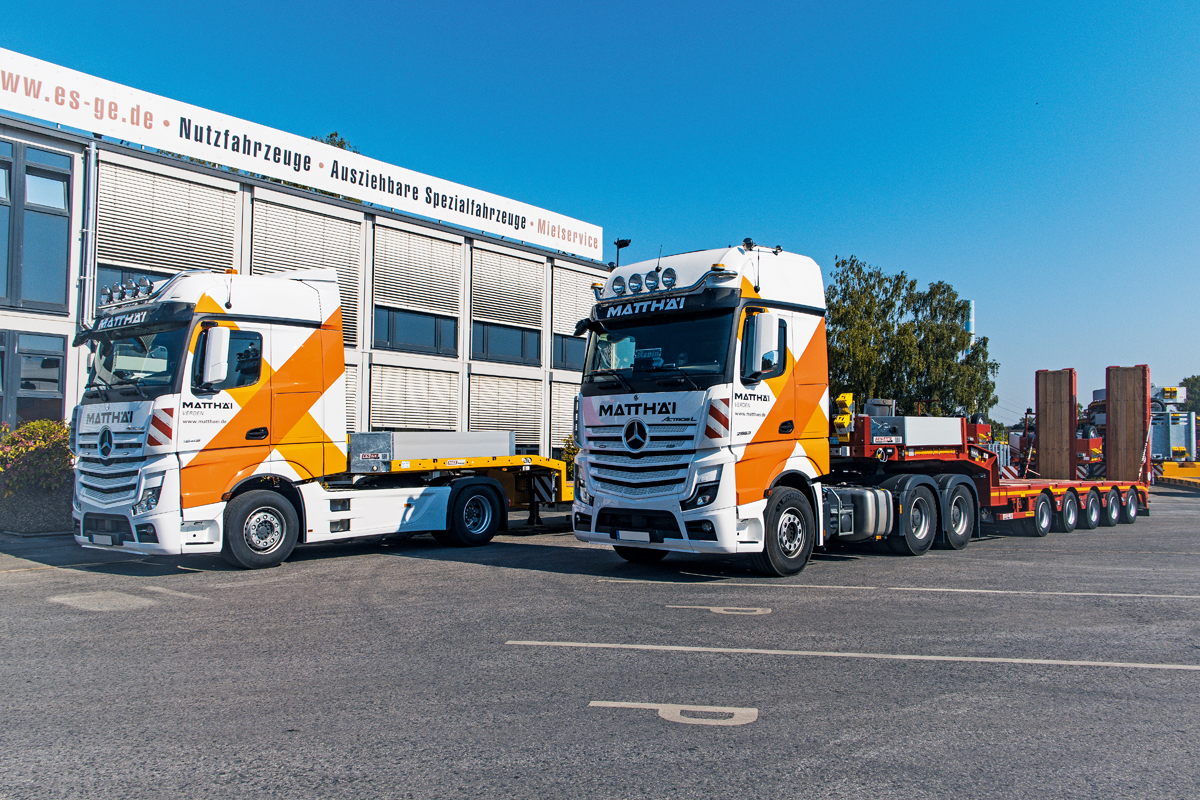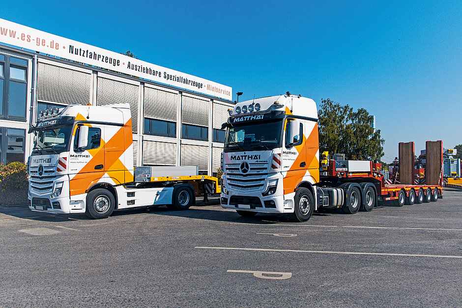 Matthäi erweiterte den Fuhrpark um zwei neue Satteltieflader: einen Max Trailer Max110 mit drei Achsen sowie einen fünfachsigen MultiMax von Faymonville. Beide Fahrzeuge wurden den spezifischen Anforderungen der Matthäi-Gruppe entsprechend individuell gestaltet. Durch den direkten Zugriff auf die Planungssoftware von Max Trailer und Faymonville ist es dem Team der ES-GE möglich, Detailplanungen bis hin zum Fertigungsauftrag komplett intern abzuwickeln. Reservierte Bauplätze in der Fertigungsplanung bieten dem Vertriebsteam zudem die nötige Flexibilität, um Fertigungskontingente bei Bedarf zu tauschen und Lieferfristen zu optimieren.