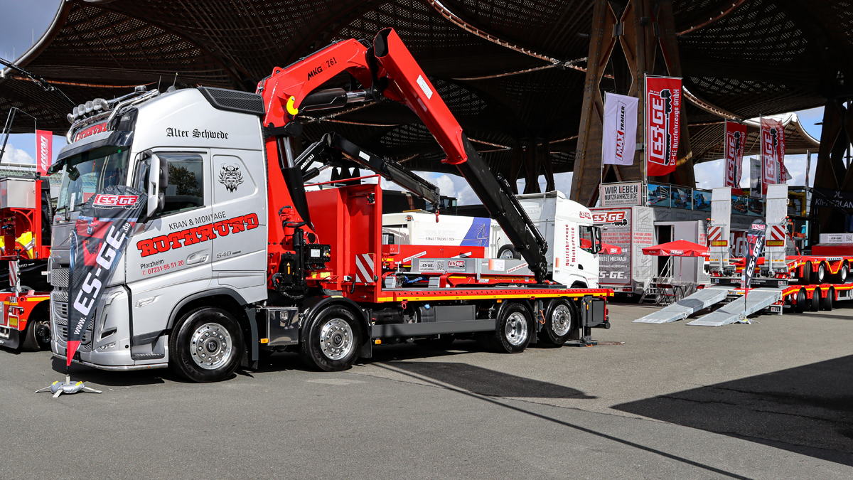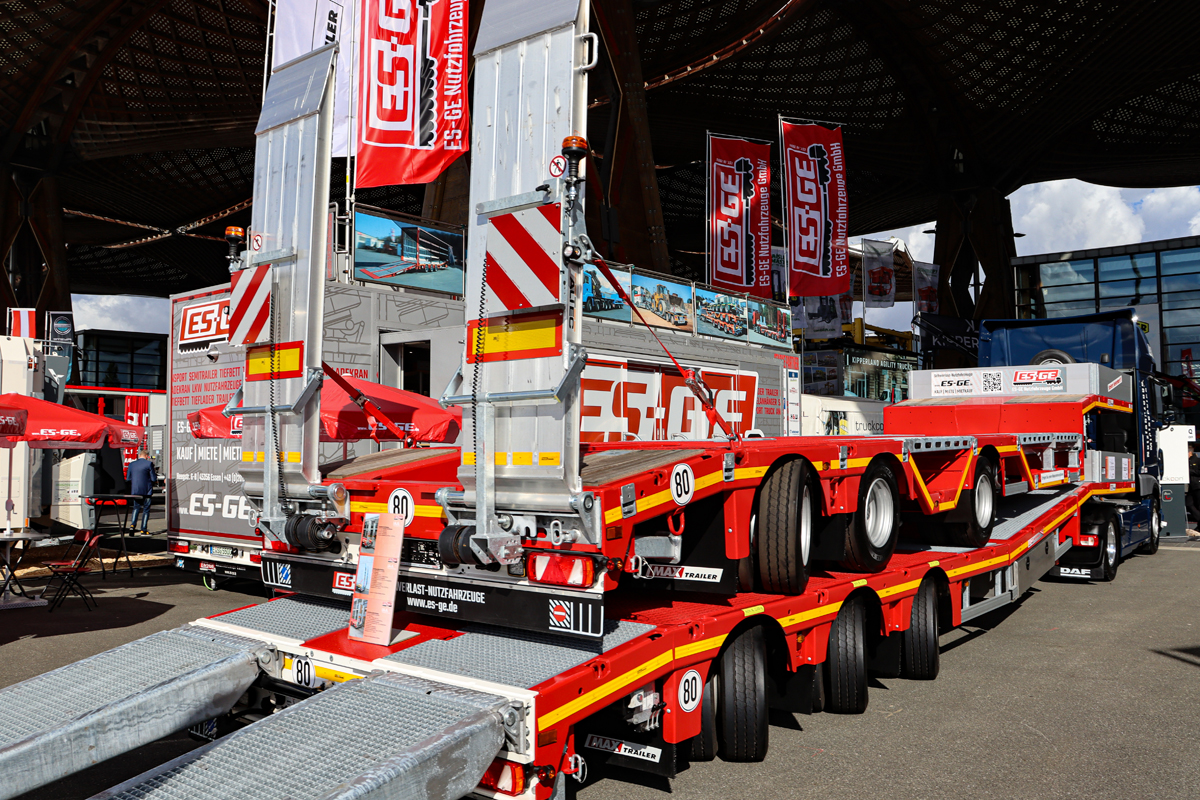 Auf der Messe soll bereits auf den ersten Blick deutlich werden, wofür die ES-GE steht. Das Team aus Essen reist mit hochwertigen Produkten namhafter Hersteller an. Als enger Partner und Topseller im Vertriebsnetz von MAX Trailer plant die ES-GE, Neuheiten der etablierten Marke aus der Faymonville Gruppe zu präsentieren. Neben den Kernprodukten, zu denen teleskopierbare Satteltieflader, Tiefbettauflieger, Ballastauflieger oder auch maßgeschneiderte Schwerlast-Anhänger zählen, wird die ES-GE auch motorgetriebene Fahrzeuge präsentieren. Denn insbesondere der Bereich der Vermietung und des Verkaufs individuell angefertigter Zugfahrzeuge mit Ladekran sei in den vergangenen Jahren nachhaltig ausgebaut worden. Auf der Bauma präsentiert die ES-GE auf dem eigenen Stand daher gleich zwei Fahrzeuge mit Ladekran, die eigens für die Messen IAA und Bauma aufgebaut worden sind: Eine 6x4 Sattelzugmaschine von Mercedes Benz sowie ein 8x2 LKW aus dem Haus Volvo, für den die ES-GE den passenden Tandemanhänger mitliefert. Beide Zugfahrzeuge sind mit einem Ladekran von MKG ausgestattet und sind, wie sämtliche Anhänger und Auflieger, Teil des umfangreichen Mietpools der Essener.