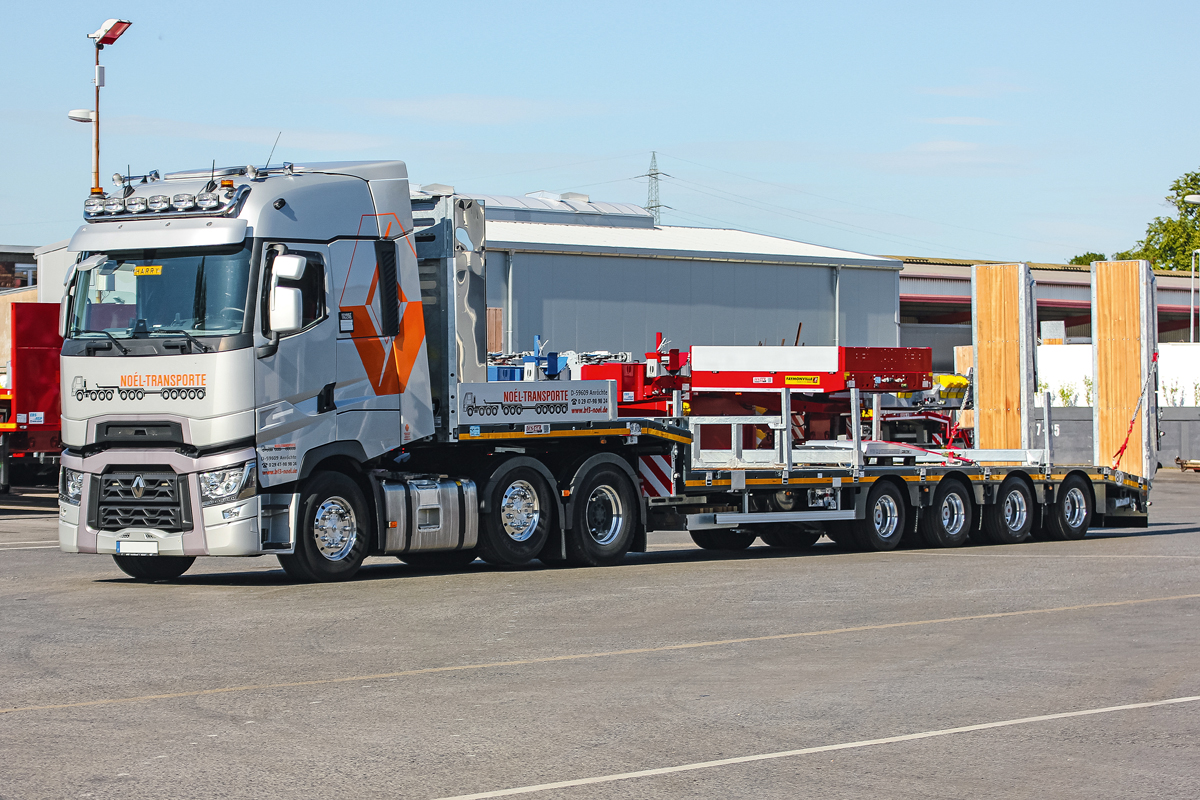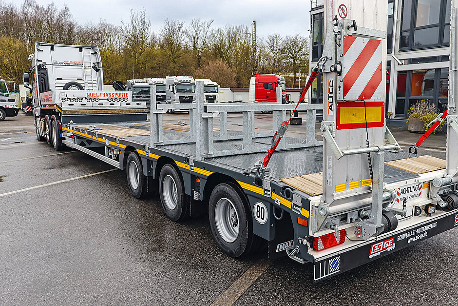 Dem individuellen Noél-Anforderungsprofil entsprechend sind alle bisher von ES-GE ausgelieferten Fahrzeuge teleskopierbar. Das neueste Upgrade des Fuhrparks stand kürzlich in Essen zur Abholung bereit – ein doppelt teleskopierbarer Tieflader der Marke Max Trailer. Der ausgelieferte Max 110 kann technisch und damit jeweils bei Bedarf um bis zu ca. 13 300 mm ausgezogen werden. Mithilfe im Außenrahmen versenkter Verbreiterungen wächst das Fahrzeug individuell für die jeweilige Aufgabe auch in der Breite auf insgesamt ca. 3 000 mm. Am Heck verfügt die Ladefläche über eine Abschrägung inklusive Einhängeleisten, die das schnelle und unkomplizierte Anlegen von Rampen ermöglichen. Neben losen, anlegbaren Rampen lässt sich der Satteltieflader allerdings auch optional mit ein- oder zweiteiligen Rampen ausstatten. Für den Max 110 sind sowohl Rampen mit Federhebewerk als auch elektrohydraulisch zu bedienende Rampen im Konfigurator hinterlegt.