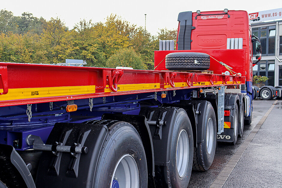 Der ca. 11 550 mm lange 4-Achser verfügt über drei gelenkte Achsen. Achsen zwei, drei und vier werden mithilfe einer mechanischen Tridec-Zwangslenkung gesteuert. Die Drehschemel-Zwangslenkung sorgt für einen maximalen Lenkeinschlag von ca. 20°, 30° und 45°. Abweichend vom Standard ist der Ballastauflieger zudem mit einer Liftachse ausgestattet. Die luftgefederten Achsen verfügen über Trommelbremsen, die über ein Druckluftbremssystem von Marke Knorr gesteuert werden. ES-GE-Ballastauflieger lassen sich überdies auch auf Wunsch detailliert konfigurieren.t