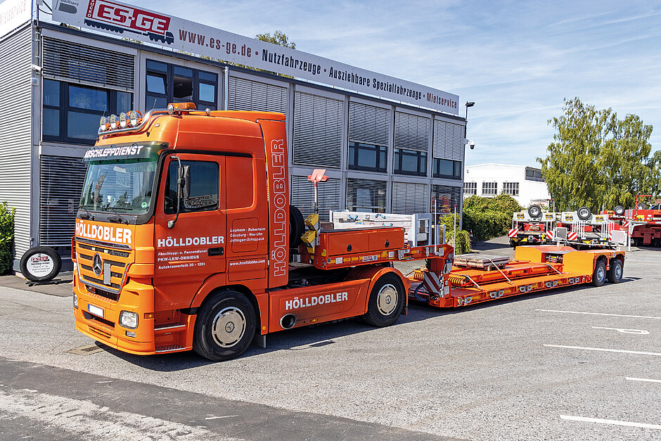 Der Tiefbettauflieger wurde mit zahlreichen Sonderausstattungen geliefert, die speziell auf die Bedürfnisse von Hölldobler zugeschnitten sind. Hierzu zählen eine Seilwinde an der Löffelstielmulde im Fahrwerk, abfahrbare Stahlrampen mit Kletterleisten sowie eine eigens installierte Halterung für eine ca. 2 500 mm lange Abschlepphilfe. Diese Ausstattungsmerkmale erleichtern das Auffahren und die Bergung von Fahrzeugen erheblich und tragen zur vielseitigen Einsetzbarkeit des Tiefbettaufliegers bei.