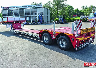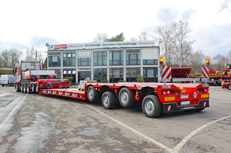 Der Einsatz von Fahrzeugen aus dem ES-GE-Miet-Pool ermöglichte beispielsweise dem Unternehmen Auto-Service SAFAR die Erschließung neuer Geschäftsfelder. Als einer der größten Anbieter im Rhein-Main-Gebiet ist das Unternehmen jährlich allein in mehr als 50 000 Einsätzen für den ADAC tätig und kümmert sich um liegengebliebene Fahrzeuge. Zu den Serviceleistungen gehören Bergungsarbeiten sowie das Abschleppen von u. a. Lkw oder Sattelzugmaschinen, mittlerweile aber auch reine Transportdienstleistungen. Gleich zwei Fahrzeuge holte das Team von Auto-Service SAFAR zuletzt im Ruhrgebiet bei ES-GE ab: Einen VarioMax von Faymonville und einen fünfachsigen Max100 der Faymonville-Tochtermarke Max Trailer. Gezogen wird der Auflieger von einem MAN 33.580 6x4, der ebenfalls aus dem ES-GE-Bestand stammt, aber seit fast einem Jahr im Einsatz für Auto-Service SAFAR ist. t