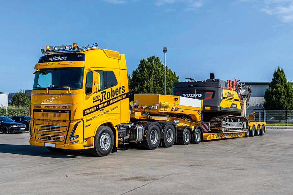 Auf dem ES-GE-Betriebsgelände in Essen stand nicht nur der MegaMax zur Abholung bereit. Zu dem Tiefbettauflieger gehört ebenso ein optional einsetzbarer zweiachsiger Dolly. Das Tiefbett lässt sich grundsätzlich auch ohne die zusätzlichen beiden Achsen nutzen. Wird der Dolly nicht benötigt, lässt er sich auf dem Tiefbett platzieren. Das lässt sich mit dem abfahrbaren Schwanenhals umsetzen. Dafür wurde am Mittelteil des Schwanenhalses eine Abschleppkupplung verbaut, mit deren Hilfe sich der Dolly rangieren und auf die Ladefläche fahren lässt. Unter Berücksichtigung der in Deutschland zulässigen Achslasten und Fahrzeuggewichte, kommt die abgebildete Fahrzeugkombination des ES-GE-Kunden inklusive Dolly auf ein Zuggesamtgewicht von ca. 87,5 t. Die Nutzlast des Zuges beträgt entsprechend etwa 52 t.