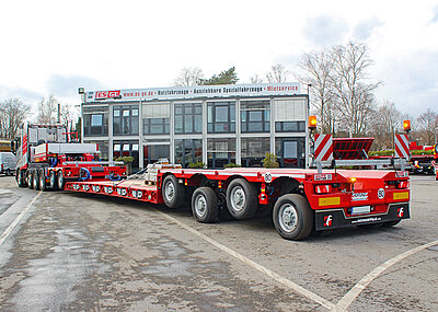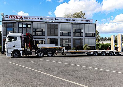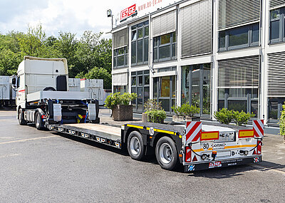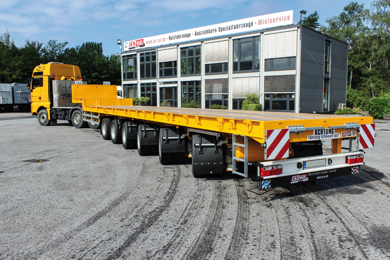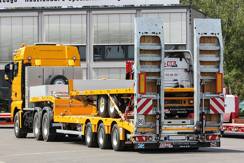 Schmidbauer hat kürzlich ein Exemplar von ES-GE in Empfang genommen. Der zwillingsbereifte ES-GE-Ballastauflieger wiegt ca. 19 000 t. Die maximale Sattellast und die Achsen ermöglichen auf technischer Basis eine theoretisch mögliche Nutzlast von bis zu ca. 66 000 kg. Das Ladebett ist ca. 1 270 mm hoch. Fünf der sechs Achsen werden gelenkt. Die liftbare, erste Achse verfügt über eine Vorlauflenkung. Die Achsen drei bis sechs werden über eine hydraulische Zwangslenkung gelenkt. Die zweite Achse ist starr, aber ebenfalls liftbar. Die hydraulisch gelenkten Achsen lassen sich manuell mithilfe einer Funkfernbedienung nachlenken.