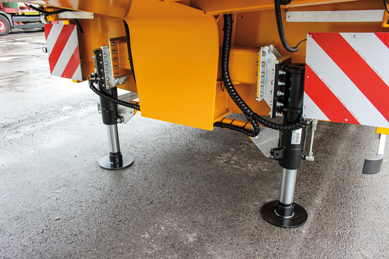 Auch ein weiterer Max-Trailer Max110 hat ebenfalls den Dienst für die Schmidbauer Gruppe aufgenommen. Es war der zwölfte Auflieger dieses Typs, den die ES-GE innerhalb der letzten zwei Jahre an die Schmidbauer-Gruppe ausgeliefert hat – alle waren modifiziert. Die manuellen Sattelstützen wurden gegen hydraulisch zu bedienende Sattelstützen getauscht. Mit dem Tausch der Stützen ging die Installation einer automatischen Senkanlage einher, die ein Abknicken der Stützwinden verhindert. Beim »schleichenden« Absenken der Ladefläche können irreparable Schäden an den Stützen entstehen, daher ist das System als Sicherheitseinrichtung implementiert worden. Das Absenken der Stützen erfordert ein vorheriges Ablassen der Luft aus dem Fahrwerk. t