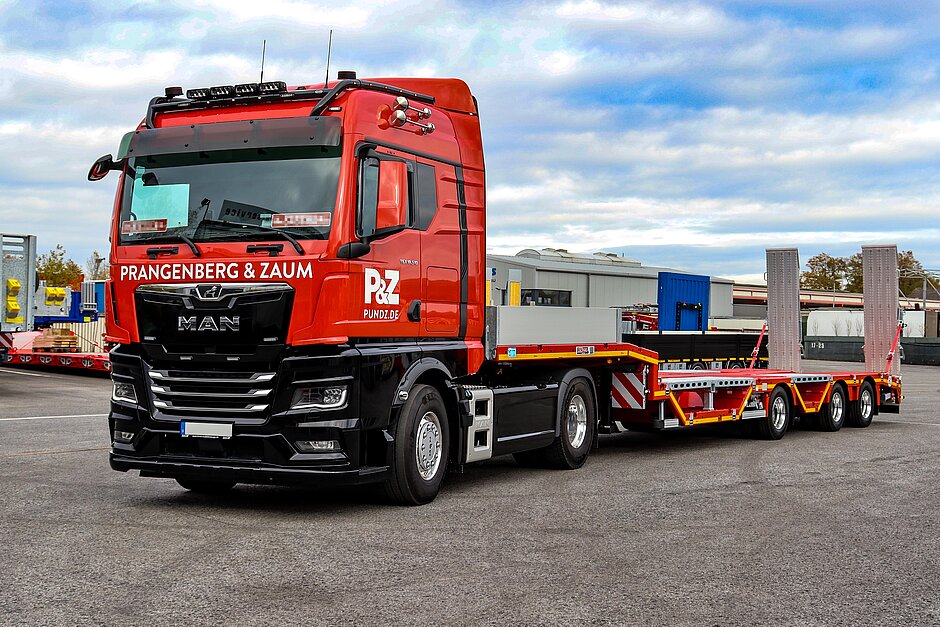Der gelieferte Satteltieflader MAX100 von MAX Trailer ist ein luftgefederter, nachlaufgelenkter Satteltieflader. In der gewählten Ausstattung beträgt das Leergewicht ca. 9.300 kg. 3 x 10.000 kg Achslast sowie die Sattellast von 18.000 kg ergeben rein rechnerisch eine technisch mögliche Nutzlast von ca. 38.700 kg. Abweichend vom Standard sind im Ladebett des Tiefladers zwei Paar Radmulden verbaut – ein Paar vor der ersten Achse und ein Paar zwischen der ersten und der zweiten Achse. Eine ebene Ladefläche lässt sich ohne großen Aufwand mit Abdeckungen erzeugen.