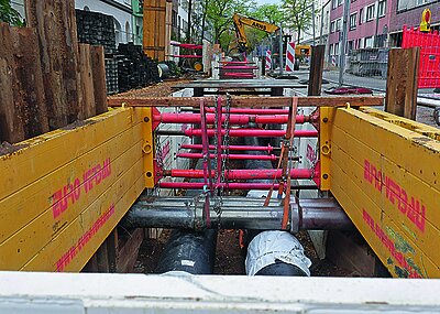 Als Lösung für solche Tiefen lieferte Euro Verbau ein Doppel-Gleitschienen-System im Parallelverbau, kurz »DGPV«, in die Via dei Gordani. Auf einer Länge von 9 m wurde das System eingesetzt und immer wieder verschoben, sodass der neue Kanal reibungslos verlegt und mit dem alten Kanalsystem verbunden werden konnte. Dabei meisterte das »DGPV«-System noch eine zweite Herausforderung, die typisch für Rom ist: Die Stadt ist sehr dicht bebaut, entsprechend stabil muss eine solche Baustelle sein. »Eine Herausforderung, die wir fast im gesamten Stadtgebiet von Rom antreffen«, erklärt Marco Verstraaten. »Der Boden darf sich auf keinen Fall absenken, das birgt die Gefahr von Rissen und kann die alten Fundamente der umliegenden Gebäude beschädigen.« Das stabile »DGPV«-System, das u. a. über eine noch stärkere Version der Gleitschienen mit Spindelaussteifung verfügt, sorgte dafür, dass die Stabilität des Erdreichs und der Fundamente gewahrt blieb.d