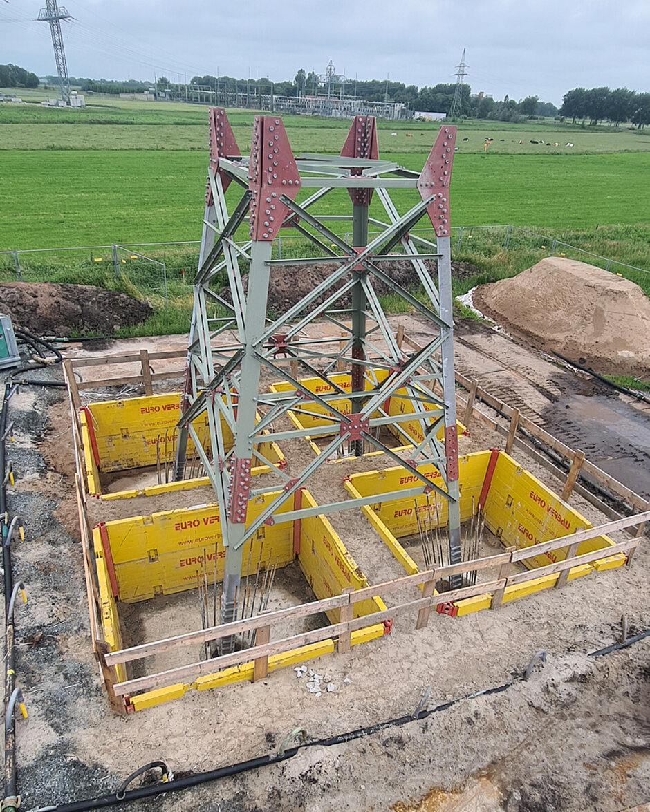 Um die Fundamente zuverlässig zu erstellen, hebt Herzog mit seinem Team für jedes Maststandbein eine 4 m x 4 m breite und 2,4 m tiefe Grube aus. Für die Gründung der Masten werden je nach Bodenbeschaffenheit zuerst Ramm- und Bohrpfähle tief in den Boden getrieben, später wird um die Pfähle herum die Grube mit Beton verfüllt. Auf den gekappten Enden der Pfähle werden dann die Stahlgestelle aufgebaut.