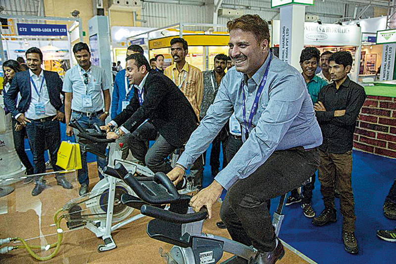 Eine der Attraktionen am Evonik-Stand sind die beiden »Efficiency Bikes«, die seit der Bauma 2013 ein fester Bestandteil der Evonik-Messeauftritte sind. Dabei handelt es sich um zwei identische Fitnessräder, die hydraulische Pumpen antreiben, vergleichbar mit den Pumpen, die in Baumaschinen zum Einsatz kommen. Eines der hydraulischen Systeme verwendet ein mit der Dynavis-Technologie formuliertes Fluid, das andere ein herkömmliches Hydrauliköl. Während die »Radfahrer« die Pumpleistung erbringen, ist anhand einer Flüssigkeitssäule zu sehen, wie viel effizienter das Dynavis Bike ist.