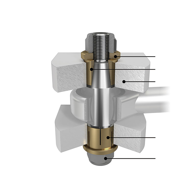 Das Expander-System besteht aus einem an beiden Enden konisch zulaufenden Bolzen, zwei Spreizhülsen, zwei Spannscheiben und zwei Befestigungselementen. Zieht man die Befestigungselemente an, drücken die beiden Spannscheiben die Spreizhülsen über die konischen Enden des Bolzens.
