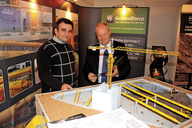 Der Einladung der Versuchsanstalt für Geotechnik und des Fördervereins der Freunde des Instituts für Geotechnik waren über 300 Gäste aus Forschung und Industrie gefolgt. Noufer Bassili, Bau-Ingenieur bei Groundforce, und Peter Richardson, Director Major Projects Europe, waren gemeinsam angetreten, um in der begleitenden Fachausstellung die technischen Besonderheiten des Groundforce-Systems zu erläutern und sich den Fragen des Fachpublikums zu stellen. Zur besseren Veranschaulichung der unterschiedlichen Einsatzmöglichkeiten der hydraulischen Sicherungssysteme hatte Groundforce ein maßstabsgerechtes Modell einer Großbaustelle mit verschiedenen Hydraulik-Steifen bereitgestellt. Als Träger für das Modell fungierte dabei der hölzerne Nachbau eines Adapterstücks einer großen Hydraulikabstützung.