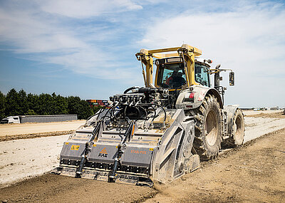 Eine Stabilisierungs- und Multifunktionsfräse des FAE-Typs MTH war für Stabilisierungsarbeiten am Flughafen von Bozen gefordert. Ausführende Unternehmen für die Arbeiten an der Start- und Landebahn war die Firma Brunner & Leiter aus dem Ahrntal bei Bozen. »Die FAE MTH wurde mit einem Fendt-Traktor des Typs 1038 eingesetzt, um eine Fläche von 11 000 m² bis in 25 cm Tiefe zu stabilisieren«, berichtet der Bauleiter von Brunner & Leiter. »Die Maschine hätte auch in einer größeren Tiefe arbeiten können, aber das Leistungsverzeichnis gab vor, diese Marke einzuhalten. Das Gelände war nicht besonders schwierig zu bearbeiten, enthielt jedoch einige mittelgroße Steine, die der MTH keinerlei Probleme bereitet haben.«