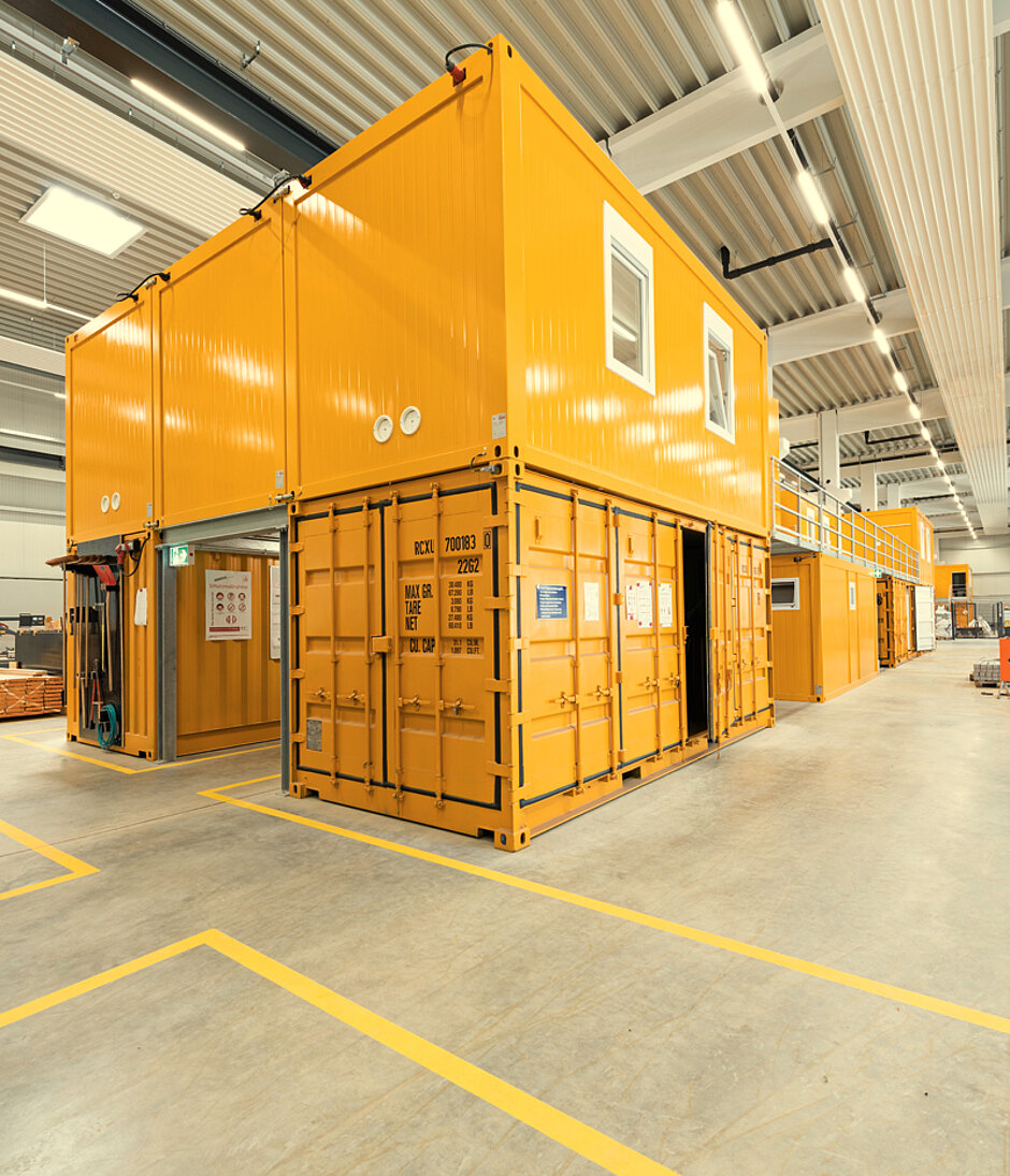 Unmittelbar in die Ausbildungshalle integriert, ergänzt eine zweistöckige, 295 m² große Anlage aus 20 Fagsi-Kauf-Containern das Raumangebot um sechs rund 14 m² große Materiallager und sanitäre Anlagen im Erdgeschoss. Im Obergeschoss sind zwei Büros, drei Besprechungsräume – zwischen 28 m² und 42 m² groß – sowie ein 28 m² großer Raum für Messtechnik untergebracht.