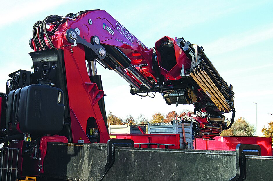 Zwischen Leergewicht und zulässigem Gesamtgewicht gibt’s da eigentlich keinen Unterschied«, scherzt Markus Söhnge, Projektplaner beim Kranunternehmen Riga Mainz, als er den letzten Neuzugang seines Unternehmens vorstellt. Der F2150 ist ein »Trumm von einem Kran«, das mit Leistungsdaten punkten will, die man bei einem Ladekran nicht erwarten würde. Immerhin stemmt das Topmodell der Marke Fassi ein Hubmoment von bis zu 1 012 kNm.