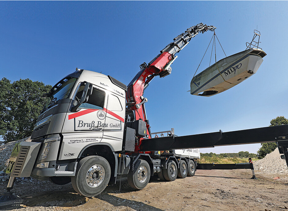 Solche Anfragen erreichen Bruß seit Kurzem vermehrt, denn der Neuzugang in seinem Fahrzeugpark, ein fünfachsiger Volvo FH 540 mit einem Fassi-Ladekran des Typs F2150RA.2.28, hat sich in der norddeutschen Provinz schnell herum gesprochen. Bruß’ Firma, deren Kerngeschäft vor allem im Rohbau von Ein- und Mehrfamilienhäusern und Gewerbebauten liegt, hatte die Neuanschaffung für die Erledigung eines Großauftrags im Zusammenhang mit dem Bau der Nordlink-Kabeltrasse zwischen Büsum und Wilster getätigt, bei dem vorgefertigte Behelfsbrücken aus Stahlbeton oft über erhebliche Distanzen hinweg über Gräben und Wasserläufe zu manövrieren sind.