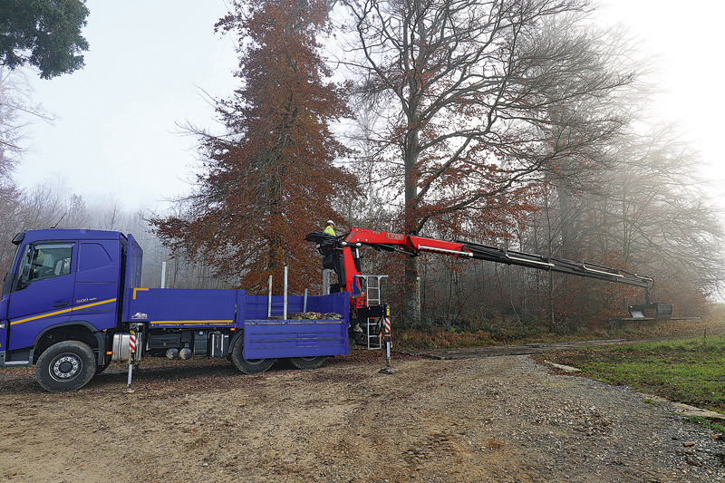 Norbert Grundmann rangiert für seinen Verlege-Job den neuen Volvo FH 500 des Arbeitgebers auf der Schwäbischen Alb am Ende eines asphaltierten Feldwegs. Auf dem am Heck montierten Fassi-Ladekran F315RA.2.25 sitzend, packt er einen Stapel Fahrbohlen und beginnt vom Lkw aus nach hinten voranschreitend mit ihrer paarweisen Platzierung auf dem weichen Boden am Waldrand. Mit fünf Ausschüben erreicht der Kran beim Auslegen der rund 5 m langen Massivholzbohlen eine stattliche Reichweite von 14,6 m und kann so drei Bohlen hintereinander auslegen. Dann aber muss der Volvo nach hinten versetzt werden.